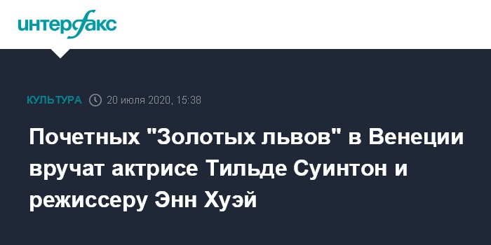 Москва. 20 июля. INTERFAX.RU - Британская актриса Тильда Суинтон и гонконгский режиссёр Энн Хуэй стали обладательницами почетных "Золотых львов" Венецианского кинофестиваля за жизненные достижения, сообщили в пресс-службе смотра.
