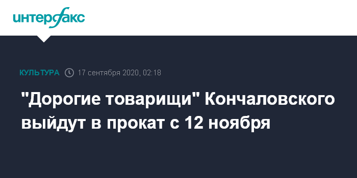 "Спешим сообщить о том, что стала известна дата выхода в широкий прокат в России нового фильма Андрея Кончаловского "Дорогие товарищи!". Российские зрители смогут увидеть картину на экранах кинотеатров 12 ноября 2020 года", - говорится в сообщении.