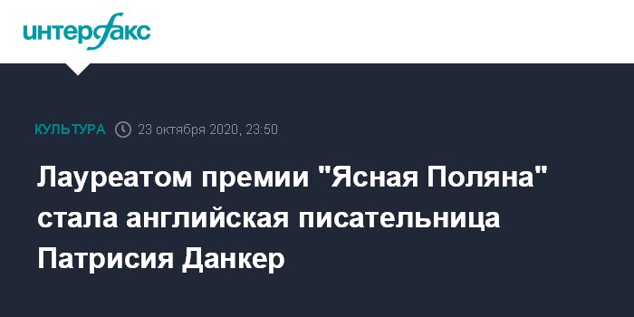 Москва. 23 октября. INTERFAX.RU - Английская писательница и критик Патрисия Данкер стала лауреатом литературной премии "Ясная Поляна" в номинации "Иностранная литература" за роман "Джеймс Миранда Барри", сообщили "Интерфаксу" в пятницу в дирекции музея-заповедника "Ясная Поляна" (Тульская область).