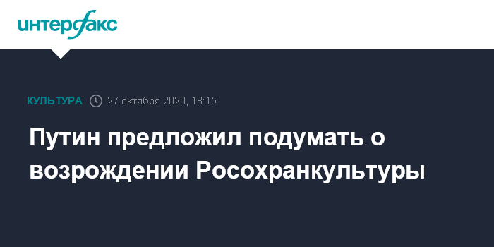 Москва. 27 октября. INTERFAX.RU - Президент Владимир Путин предложил обдумать возможность возродить профильный орган по контролю за строительством и реставрацией памятников, аналогичный упраздненной Росохранкультуры. Он сказал это на заседании Совета при президенте по культуре и искусству.