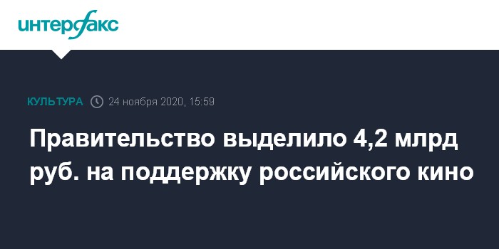 Москва. 24 ноября. INTERFAX.RU - Правительство выделило из своего резервного фонда 4,2 млрд рублей министерству культуры на поддержку отечественных фильмов в российском прокате.