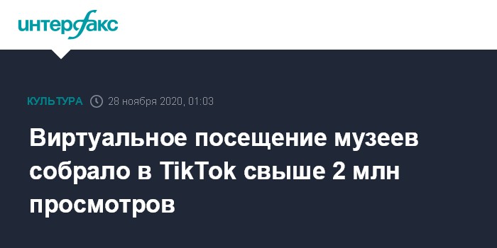 Москва. 28 ноября. INTERFAX.RU - В рамках проекта #КультурныйTikTok, организованного совместно с "Культура.РФ", в период с 12 сентября пользователи смогли посетить 25 виртуальных экскурсий.