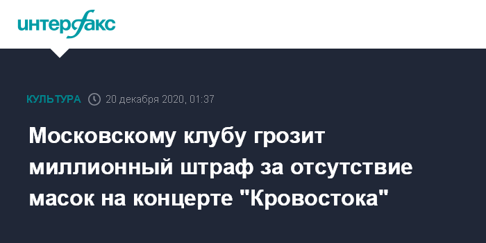 Москва. 20 декабря. INTERFAX.RU - Клуб ГлавClub в Москве может быть оштрафован на сумму до 1 млн рублей за нарушения перчаточно-масочного режима в ходе концерта группы "Кровосток", сообщил главный инспектор столичного объединения административно-технических инспекций (ОАТИ) Ян Поповский в субботу.