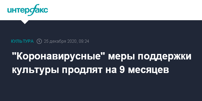 Москва. 25 декабря. INTERFAX.RU - Существующие меры поддержки культурной отрасли, введенные из-за пандемии коронавируса, будут продлены на 9 месяцев 2021 года, сообщил "Интерфаксу" советник президента РФ по культуре Владимир Толстой.