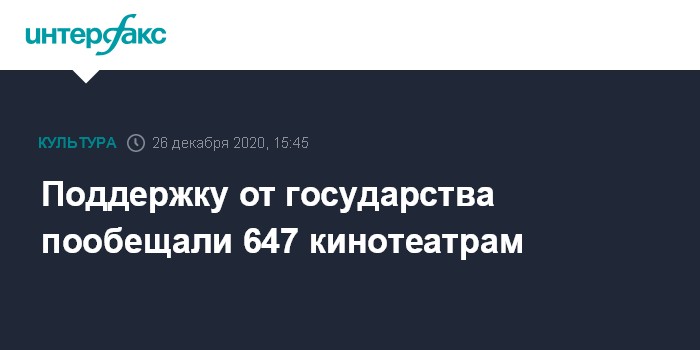 Москва. 26 декабря. INTERFAX.RU - Почти 650 кинотеатров и 54 кинокомпаний получат государственную субсидию в размере 4,2 млрд рублей, выделенную на поддержку киноотрасли из резервного фонда РФ, сообщили в пресс-службе Фонда кино.