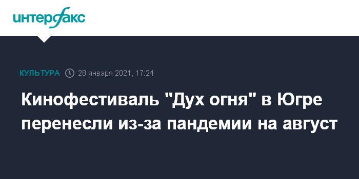 Москва. 28 января. INTERFAX.RU - Оргкомитет XIX международного фестиваля кинематографических дебютов "Дух огня" перенесет мероприятие с марта на август из-за пандемии и закрытых границ, сообщил департамент общественных и внешних связей Ханты-Мансийского автономного округа-Югры.