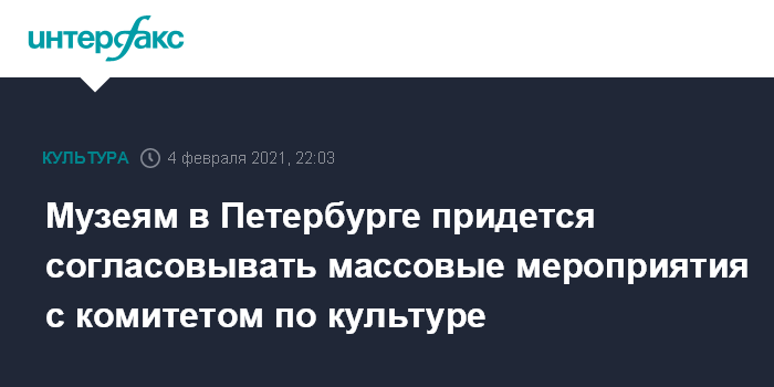 Москва. 4 февраля. INTERFAX.RU - Федеральным музеям Санкт-Петербурга до 15 мая необходимо согласовывать с Комитетом по культуре города максимально допустимое количество посетителей мероприятий, в случае если на них будет более 50 человек, а театрам и филармониям придется отказать в групповом посещении несовершеннолетним до 16 лет.