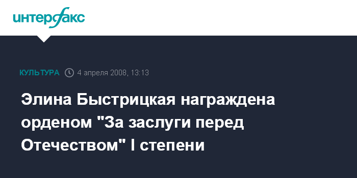 Москва. 4 апреля. INTERFAX.RU - Указом Президента России Владимира Путина актриса Малого театра Элина Быстрицкая награждена орденом "За заслуги перед Отечеством" I степени, сообщила пресс-служба президента РФ. Тем самым, Путин отметил выдающийся вклад Э.Быстрицкой в развитие отечественного театрального и кинематографического искусства, многолетнюю творческую деятельность.
