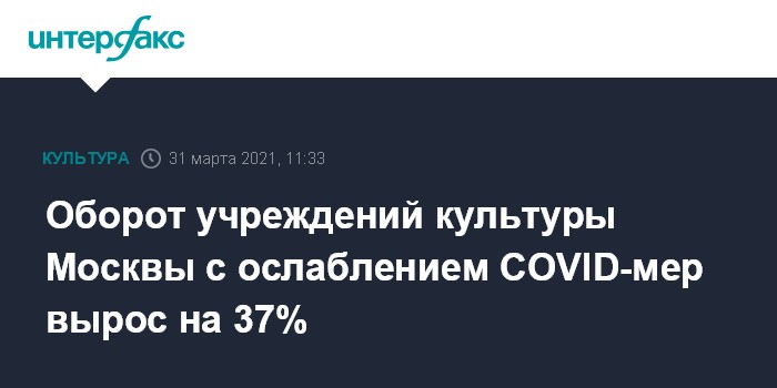 Директор ГМИИ имени Пушкина: я жду этого счастливого дня, когда все зрители вернутся в музейЧитать подробнееОн добавил, что в период с 23 января по 23 марта общий оборот учреждений культуры столицы составил 4,6 млрд руб., что составляет 71,5% от аналогичного периода 2020 года.
