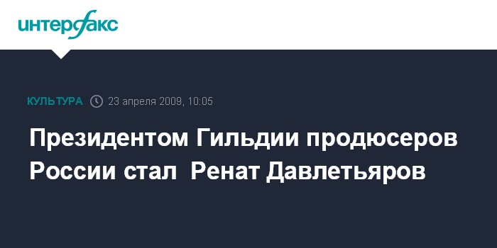 Москва. 23 апреля. INTERFAX.RU - На внеочередном заседании Гильдии продюсеров России состоялось избрание нового президента Гильдии. Им стал генеральный директор компании "Интерфест" Ренат Давлетьяров. После того, как эту должность оставил заместитель министра культуры России Александр Голутва, обязанности Президента Гильдии временно исполнял Президент Фонда Ролана Быкова Армен Медведев.