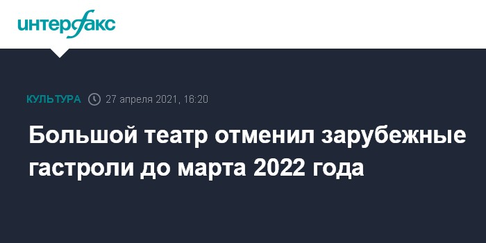 Москва. 27 апреля. INTERFAX.RU - Государственный академический Большой театр из-за пандемии отменил зарубежные гастроли до марта 2022 года, объявил на пресс-конференеции гендиректор ГАБТ Владимир Урин.
