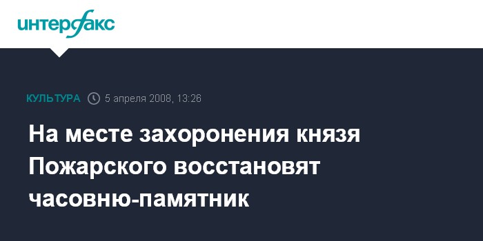 Москва. 5 апреля. ИНТЕРФАКС - Часовню-памятник на месте захоронения князя Дмитрия Пожарского в Суздале планируется построить к будущему лету и открыть в День России, 12 июня 2009 года.