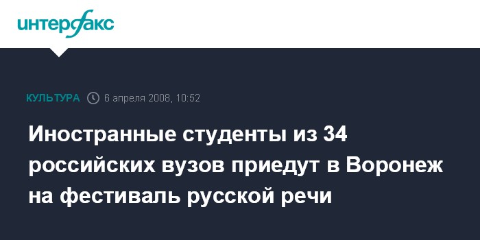 Воронеж. 6 апреля. ИНТЕРФАКС-ЦЕНТР - В Воронеже на базе института международного образования госуниверситета (ИМО ВГУ) с 14 по 18 апреля пройдет IV фестиваль русской речи иностранных студентов вузов России, сообщил "Интерфаксу" директор ИМО Владимир Родионов. По его словам, в мероприятии примут участие около 230 иностранных студентов из 34 российских вузов.
