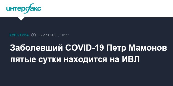 Москва. 5 июля. INTERFAX.RU - Состояние актера и музыканта Петра Мамонова, заболевшего коронавирусом, по-прежнему крайне тяжелое, он остается в реанимации на искусственной вентиляции легких (ИВЛ), сообщила "Интерфаксу" его жена Ольга Мамонова.