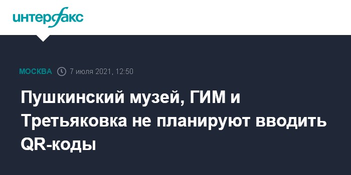 Москва. 7 июля. INTERFAX.RU - Крупнейшие федеральные музеи в Москве пока не планируют вводить допуск посетителей по QR-кодам о вакцинации или иммунитете к коронавирусу. Об этом "Интерфаксу" сообщили представители Исторического музея, Пушкинского и Третьяковки.