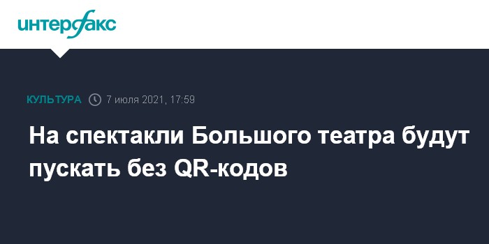 "В Большой театр зрители по-прежнему могут приходить на спектакли без QR-кода. Новые правила относительно QR-кодов пока для театров являются рекомендательной мерой и подразумевают, что если пускать в театр зрителей по кодам, то их может быть больше 500 человек (...), но руководство Большого театра не считает возможным сейчас, когда в стране такое малое количество людей по факту привито, вводить такую меру как обязательную", - сообщили "Интерфаксу" в театре.