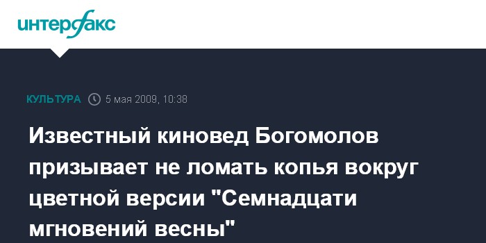 Богомолов полагает, что вокруг киноленты о советском разведчике Максиме Исаеве, не стоит ломать копья. "Если бы речь шла о том, чтобы расцветить, к примеру, "Броненосец "Потемкин" - самоценное и яркое произведение искусства - я бы сказал решительно "нет". "Семнадцать мгновений весны" можно смотреть как в черно-белом, так и в цветном, а также сокращенном варианте", - полагает киновед.