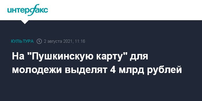 Москва. 2 августа. INTERFAX.RU - Правительство 2 августа выделит четыре млрд рублей на первый этап программы "Пушкинская карта" по расширению доступа молодежи к культурным мероприятиям, заявил премьер-министр Михаил Мишустин.