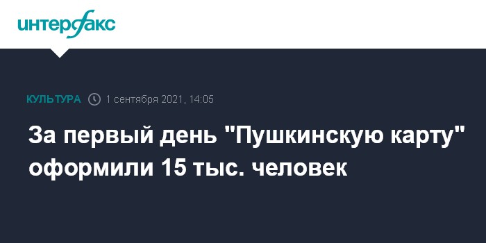 Москва. 1 сентября. INTERFAX.RU - Более 15 тысяч человек оформили "Пушкинскую карту" в первый день старта программы, сообщила глава Минкультуры РФ Ольга Любимова.