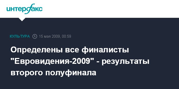 Москва. 15 мая. INTERFAX.RU - В Москве завершился второй полуфинал конкурса "Евровидение-2009". Согласно результатам голосования, путевки в финал получили следующие десять стран: Азербайджан, Хорватия, Украина, Литва, Албания, Молдавия, Дания, Эстония, Норвегия, Греция.