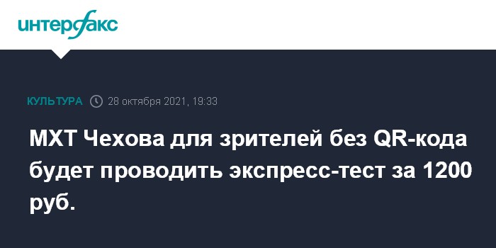 Москва. 28 октября. INTERFAX.RU - Московский художественный театр имени Чехова будет проводить экспресс-тестирование на коронавирус перед спектаклями для зрителей, у которых нет QR-кода; отрицательный результат театра позволит попасть в театр.