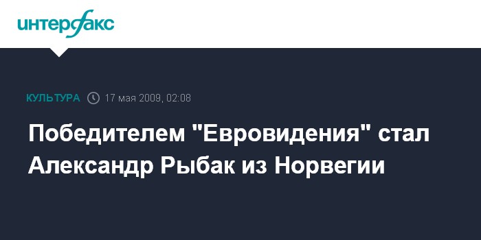 Москва. 17 мая. INTERFAX.RU – В Москве завершился конкурс "Евровидение" 2009 года. Победителем стал Александр Рыбак из Норвегии.