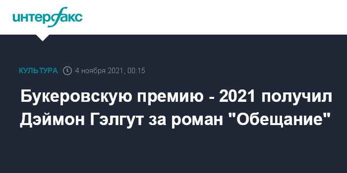 Москва. 4 ноября. INTERFAX.RU - Лауреатом Букеровской премии в 2021 году стал южноафриканский писатель и драматург Дэймон Гэлгут за роман "Обещание" (The Promise), сообщается на сайте премии. Победитель получит приз в размере $68 тыс.