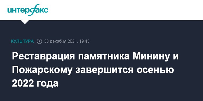 Москва. 30 декабря. INTERFAX.RU - Реставрация памятника Минину и Пожарскому на Красной площади в Москве должна завершиться осенью 2022 года, сообщили в пресс-службе Минкультуры со ссылкой на директора Государственного исторического музея Алексея Левыкина.