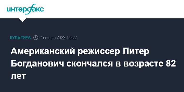 Москва. 7 января. INTERFAX.RU - Американский кинорежиссер Питер Богданович, известный по таким фильмам, как "Последнее кино" и "Бумажная луна", скончался в возрасте 82 лет. Об этом сообщает BBC News.