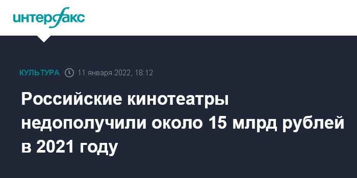 Москва. 11 января. INTERFAX.RU - В 2021 году российские кинотеатры недополучили около 15 млрд рублей по сравнению с доковидным 2019 годом, сообщил "Интерфаксу" глава Ассоциации владельцев кинотеатров Олег Березин.