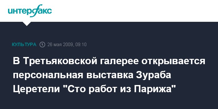 Москва. 26 мая. INTERFAX.RU - Персональная выставка президента Российской академии художеств, народного художника СССР и России Зураба Церетели "Сто работ из Парижа" открывается 26 мая в 16:00 в Инженерном корпусе Государственной Третьяковской галереи в Москве.