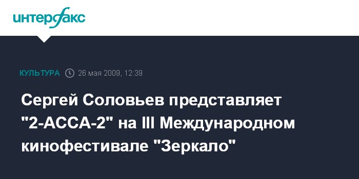 Москва. 26 мая. INTERFAX.RU - На III Международном кинофестивале имени Андрея Тарковского "Зеркало" в Иванове, в кинотеатре "Лодзь" во вторник проходит показ для журналистов фильма "2-АССА-2" (режиссер и автор сценария народный артист России Сергей Соловьев, оператор Юрий Клименко).