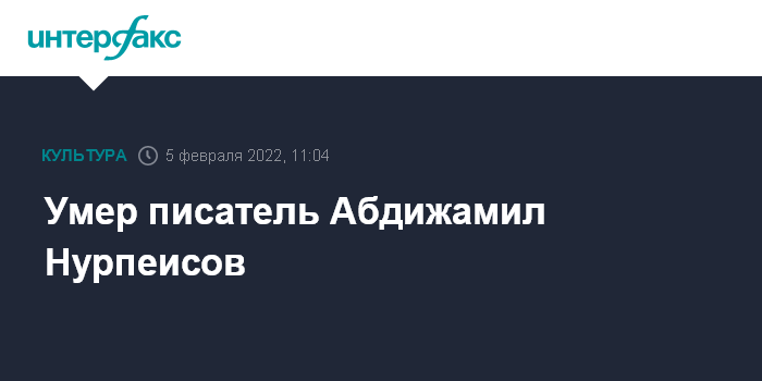 Москва. 5 февраля. INTERFAX.RU - Известный советский и казахстанский писатель Абдижамил Нурпеисов скончался в субботу в Алма-Ате на 98-м году жизни, сообщили "Интерфаксу" в Союзе писателей Казахстана.