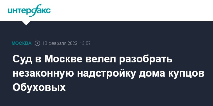 Москва. 10 февраля. INTERFAX.RU - В Москве по решению Арбитражного суда Москвы демонтируют незаконную надстройку над домом купцов Обуховых в Сухаревском переулке, сообщили в Департаменте городского имущества.
