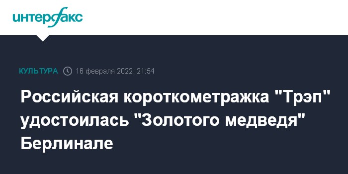 Москва. 16 февраля. INTERFAX.RU - Короткометражный фильм российского режиссера Анастасии Вебер "Трэп" удостоен "Золотого медведя" Берлинале в программе короткометражного кино.
