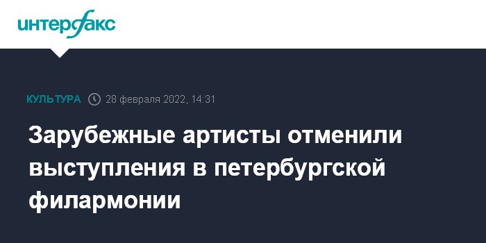 Москва. 28 февраля. INTERFAX.RU - Несколько артистов отменили мартовские выступления в Санкт-Петербургской филармонии им. Шостаковича на фоне международных событий, сообщает пресс-служба филармонии.