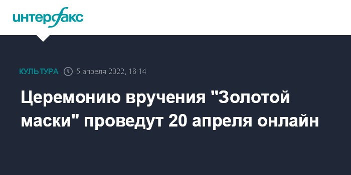Москва. 5 апреля. INTERFAX.RU - Церемония вручения национальной театральной премии "Золотая Маска" пройдет онлайн 20 апреля, как и планировалось, сообщили организаторы.