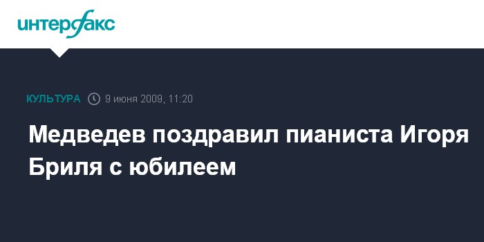 Москва. 9 июня. INTERFAX.RU - Президент России Дмитрий Медведев поздравил джазового пианиста, композитора, педагога, народного артиста РФ Игоря Бриля с 65-летием, сообщает во вторник пресс-служба Кремля. В поздравлении, в частности, говорится: "Выдающийся пианист, вы принадлежите к тем ярким, неординарным личностям, которые покоряют публику своим талантом и неиссякаемой жаждой творчества. Многогранность вашего дарования ярко проявилась и в педагогической деятельности".