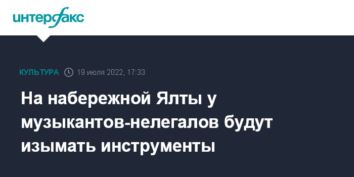 Москва. 19 июля. INTERFAX.RU - В Ялте с вечера 19 июля чиновники и полицейские начнут проводить ежедневные рейды на набережной и выявлять уличных музыкантов, которые там выступают без разрешения, у них будут изымать инструменты и усилители звука, предупредила глава администрации города Янина Павленко.