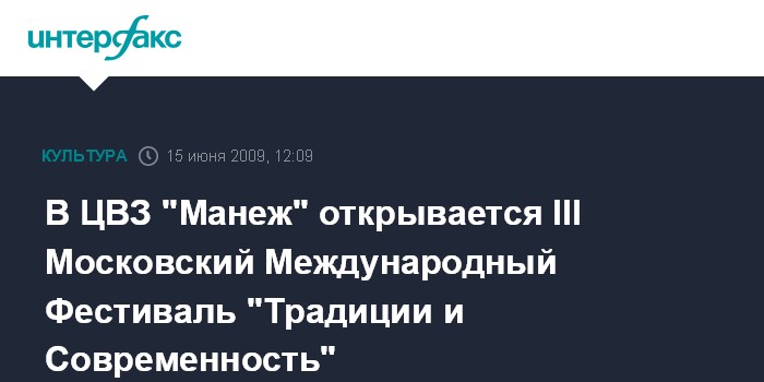 Москва. 15 июня. INTERFAX.RU - В Москве 18 июня 2009 года в Центральном Выставочном Зале "Манеж" состоится открытие III Московского Международного Фестиваля "Традиции и Современность".