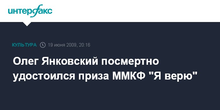 Москва. 19 июня. ИНТЕРФАКС - Приз имени Станиславского "Я верю" 31-го Московского международного кинофестиваля присужден Олегу Янковскому.
