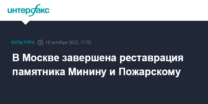 Москва. 18 октября. INTERFAX.RU - В Москве завершена реставрация памятника Минину и Пожарскому, сообщил через пресс-службу директор Государственного исторического музея Алексей Левыкин.