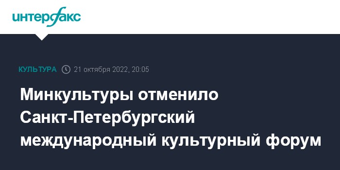 Москва. 21 октября. INTERFAX.RU - Министерт во культуры отменило Санкт-Петербургский международный культурный форум, который должен был пройти 10-12 ноября.
