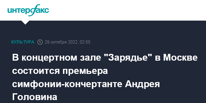 Москва. 29 октября. INTERFAX.RU - З ноября в концертном зале "Зарядье" в Москве состоится мировая премьера симфонии-кончертанте для гобоя с оркестром Андрея Головина.