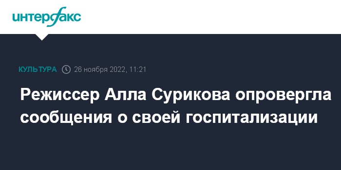 Москва. 26 ноября. INTERFAX.RU - Режиссер Алла Сурикова опровергла "Интерфаксу" сообщения СМИ о своей госпитализации с коронавирусом.