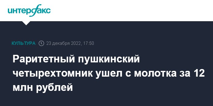 Москва. 23 декабря. INTERFAX.RU - Раритетный поэтический четырехтомник Пушкина "Стихотворения" продали на торгах за 12 млн руб., сообщает пресс-служба аукционного дома "Литфонд".