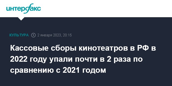 Кассовые сборы кинотеатров в РФ в 2022 году упали почти в 2 раза по сравнению с 2021 годом