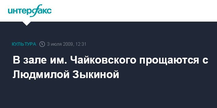 Москва. 3 июля. INTERFAX.RU – В Москве в концертном зале им. Чайковского проходит церемония прощания с народной артисткой СССР Людмилой Зыкиной. Гроб с телом Людмилы Зыкиной находится на сцене в окружении венков. Как передает корреспондент interfax.ru, находящийся на месте событий, в зале установлен большой экран, на котором демонстрируются фотографии артистки, умершей 1 июля в возрасте 81 года. Люди, пришедшие проститься с Людмилой Зыкиной, проходят в зал и садятся на свободные места. Многих из них плачут – в основном, это пожилые люди, однако есть и представители более молодого поколения. Так, девушка, пришедшая проститься с певицей, встала в зале на колени и поцеловала паркет.