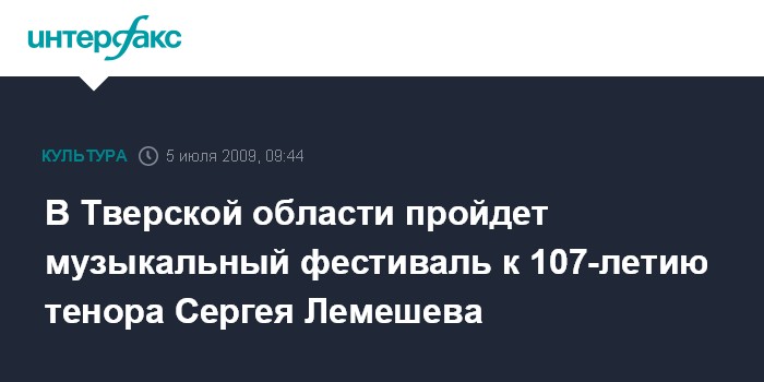 Тверь. 5 июля. INTERFAX.RU - Музыкальный фестиваль, посвященный 107-летию великого тенора ХХ века Сергея Лемешева, пройдет в Тверской области 10-11 июля, сообщили "Интерфаксу" в региональном комитете по культуре.