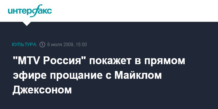 Москва. 6 июля. INTERFAX.RU - Церемония прощания с Майклом Джексоном во вторник будет транслироваться в прямом эфире телеканала MTV Россия.
